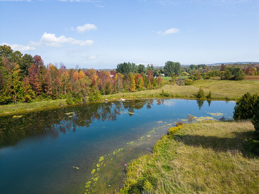 A whimsical, tree-lined driveway sets the stage, leading past fields to a home overlooking a generously sized pond. With full exposure to the east and west, mornings begin with golden sunrises over the fields and evenings close with breathtaking sunsets across the valley.